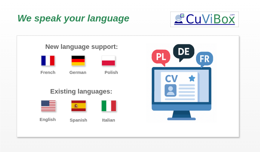 - Enhanced User Experience: Employees can now navigate the CuViBox platform and manage their CVs in their native language.